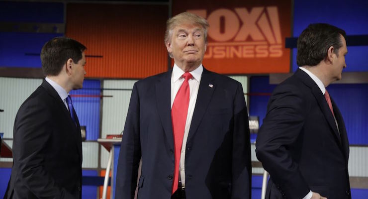 Republican frontrunner Donald Trump, center, stands on the stage flanked by Florida Sen. Marco Rubio, left, and Texas Sen. Ted Cruz, right, before the Fox Business Network Republican presidential debate at the North Charleston Coliseum, Thursday, Jan. 14, 2016. (Photo: AP)