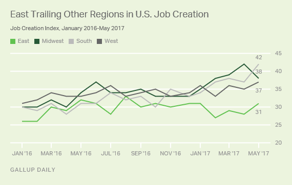 “The East has experienced virtually no growth since last fall,” Art Swift of Gallup noted.