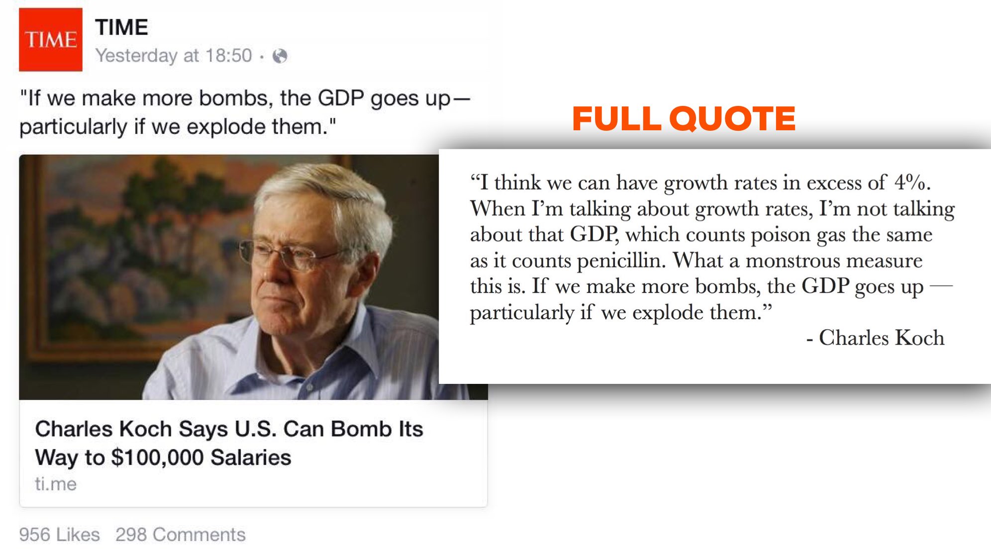 Well, I now feel compelled to comment again. But this example goes beyond bias and should be characterized as blatant and disgusting dishonesty. The hacks at Time took a quote from Charles Koch and then used selective editing to completely misrepresent what he actually said.
